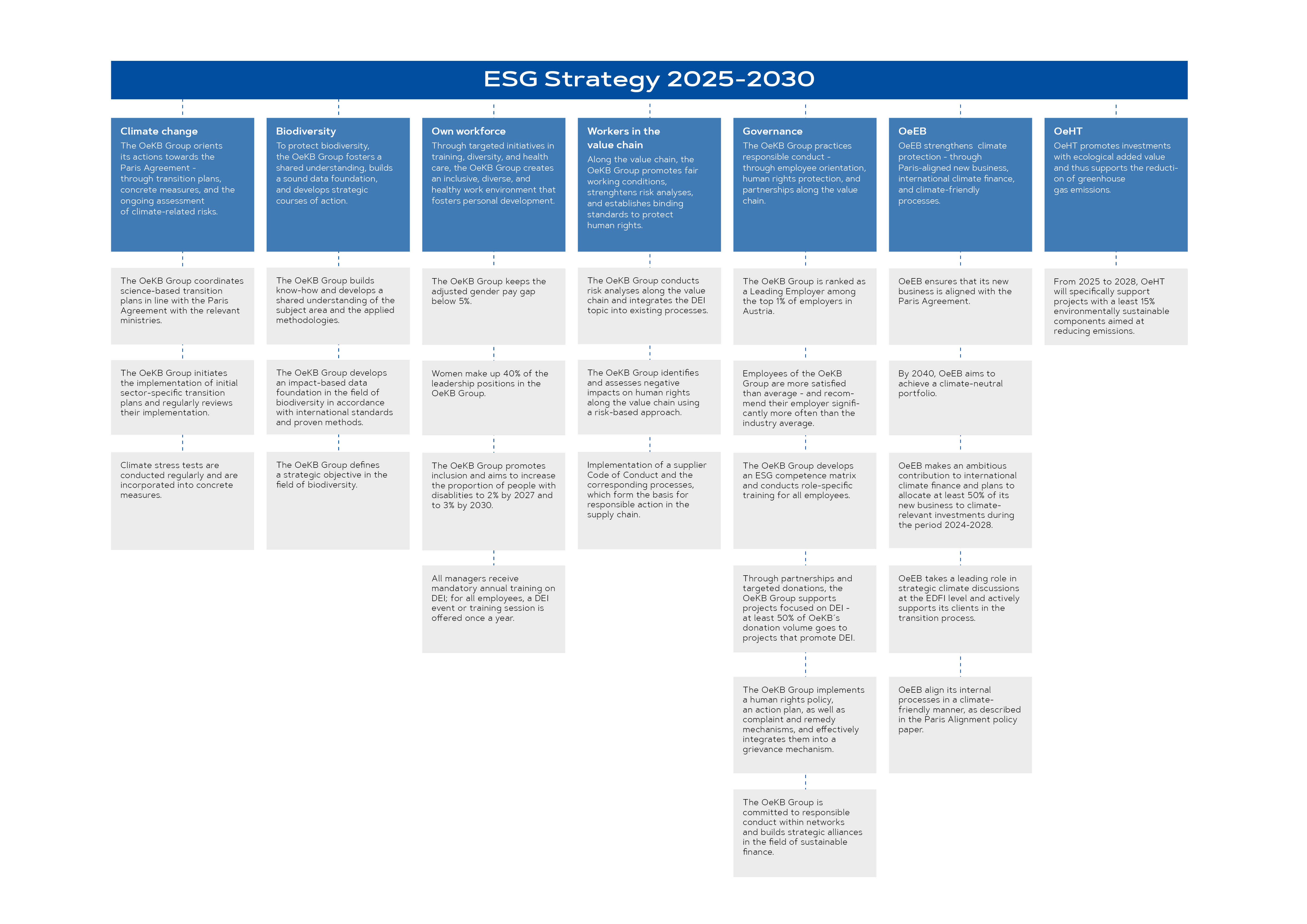 The ESG strategy for the period 2025-2030 was developed jointly with the OeKB Group´s management and specialist departments. Its implementation is based on a concrete action plan the progress of which is regularly measured and reviewed.
