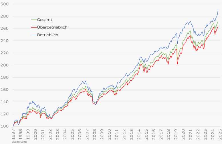 Informieren Sie sich über die Performance der österreichischen Pensionskassen und weitere Kennzahlen (Volatilität und Asset Allocation), die OeKB quartalsweise errechnet. Das 3. Quartal 2025 wird voraussichtlich ab dem 14.11.2025 veröffentlicht.